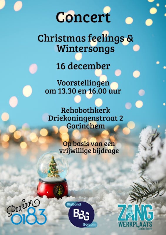 Vorig jaar kon er niemand meer bij in de overvolle kerk, daarom doen we het dit keer gewoon twee keer! Om 13.30 en 16.00 uur brengen we “Christmas feelings & Wintersongs” ten gehore in de Rehobothkerk, Driekoningenstraat 2 te Gorinchem.