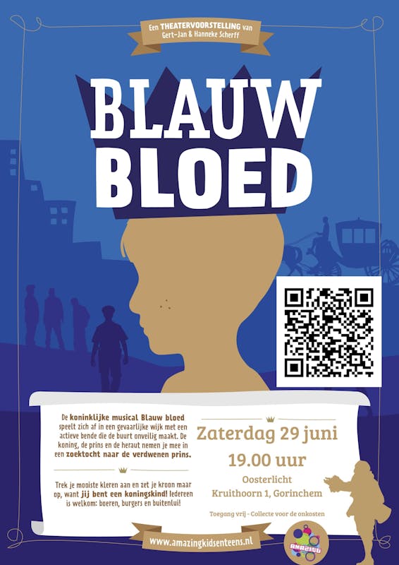 Het regionale kinderkoor Amazing Kids geeft een gratis theatervoorstelling. Met zang en dans vertellen ze het koninklijke verhaal: Blauw Bloed. Het speelt zich af in een gevaarlijke wijk met een actieve bende die de buurt onveilig maakt. Durf jij mee te zoeken naar de verdwenen prins?