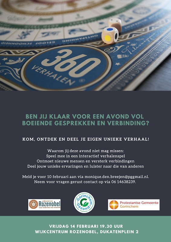 Speel mee en maak verbinding met anderen, ontdek nieuwe perspectieven en creëer waardevolle gesprekken. Meld je voor 10 februari aan via . Neem voor vragen gerust contact op via 06-14638239.
