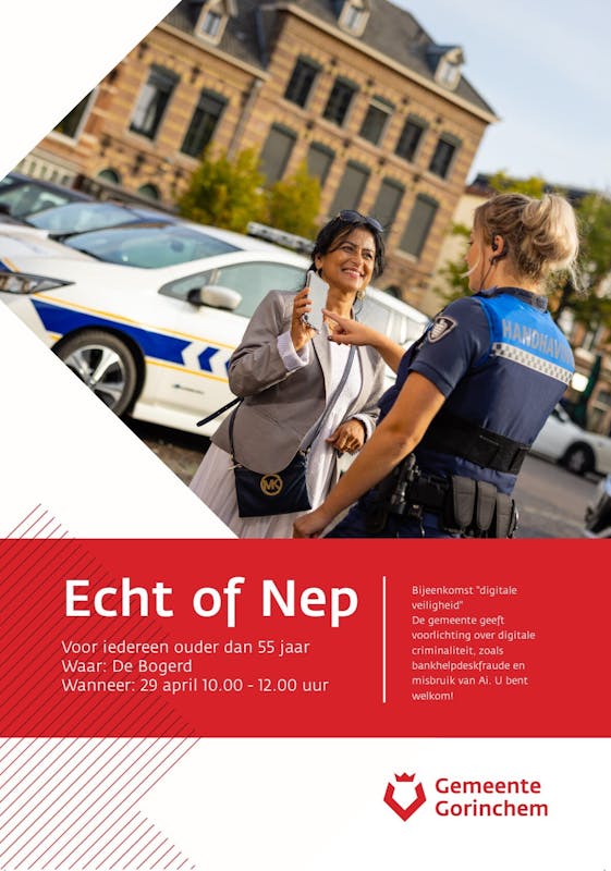 Tijdens de gratis interactieve bijeenkomst 'Echt of Nep?' wordt aan de hand van korte filmpjes met u over digitale oplichting gesproken. Tijdens de bijeenkomst krijgt u handige tips over onder andere nep e-mails en nep-berichten. Het doel is om u weerbaarder te maken tegen deze vromen van gedigitaliseerde criminaliteit.