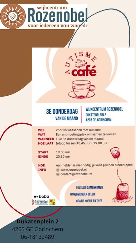 - Autisme Café wordt iedere maand op de derde donderdag van de maand van 19.00 - 20.30 uur georganiseerd