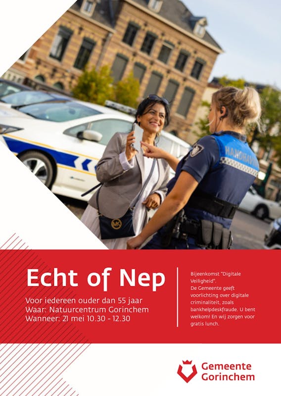 Tijdens de gratis interactieve bijeenkomst 'Echt of Nep?' wordt aan de hand van korte filmpjes met u over digitale oplichting gesproken. Tijdens de bijeenkomst krijgt u handige tips over onder andere nep e-mails en nep-berichten. Het doel is om u weerbaarder te maken tegen deze vromen van gedigitaliseerde criminaliteit.