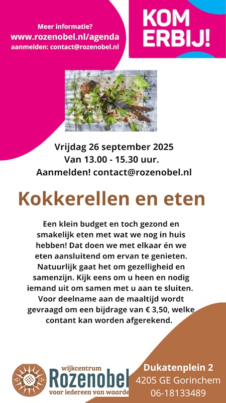 Tijdens de activiteit van vandaag kijken we naar de mogelijkheden om met een klein budget een smakelijke en gezonde maaltijd te bereiden. Dat doen we met elkaar én we eten aansluitend om ervan te genieten.