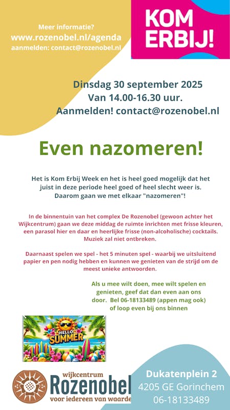 "Even nazomeren" in Wijkcentrum Rozenobel op dinsdag 30 september 2025 van 14.00-16.30 uur.