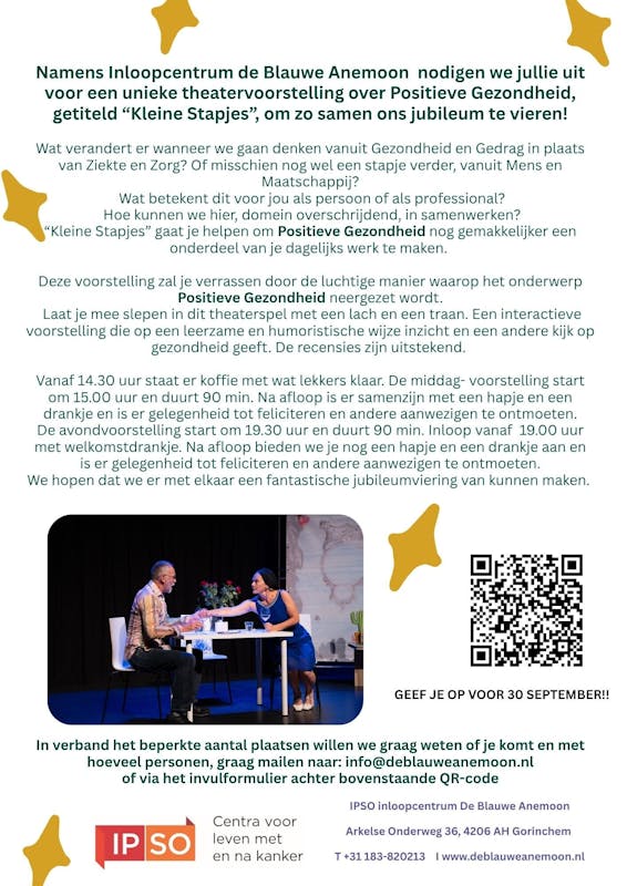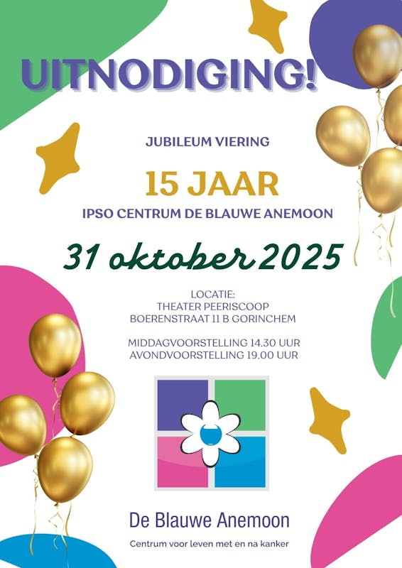 Met veel plezier nodigen wij je uit om samen met ons het 15 jarig jubileum van De Blauwe Anemoon te vieren op vrijdag 31 oktober 2025. Dit bijzondere moment willen wij markeren met een feestelijke bijeenkomst, waarin we stilstaan bij wat we samen hebben bereikt én vooruitkijken naar de toekomst. We doen dit op een manier die bij ons past: inspirerend, verbindend en met aandacht voor elkaar. Daarom presenteren wij je graag een speciale theatervoorstelling rond het thema "Positieve Gezondheid" in Theater Peeriscoop, Boerenstraat 11B te Gorinchem. Een voorstelling die ons uitnodigt om met een andere blik naar gezondheid en welzijn te kijken – vol humor, herkenning en inspiratie. We hebben een middag en een avondvoorstelling dus in verband met de beschikbare stoelen graag opgeven voor 30 september 2025. We hopen uiteraard op je aanwezigheid, om er zo met elkaar een mooi jubileumfeest van te maken.