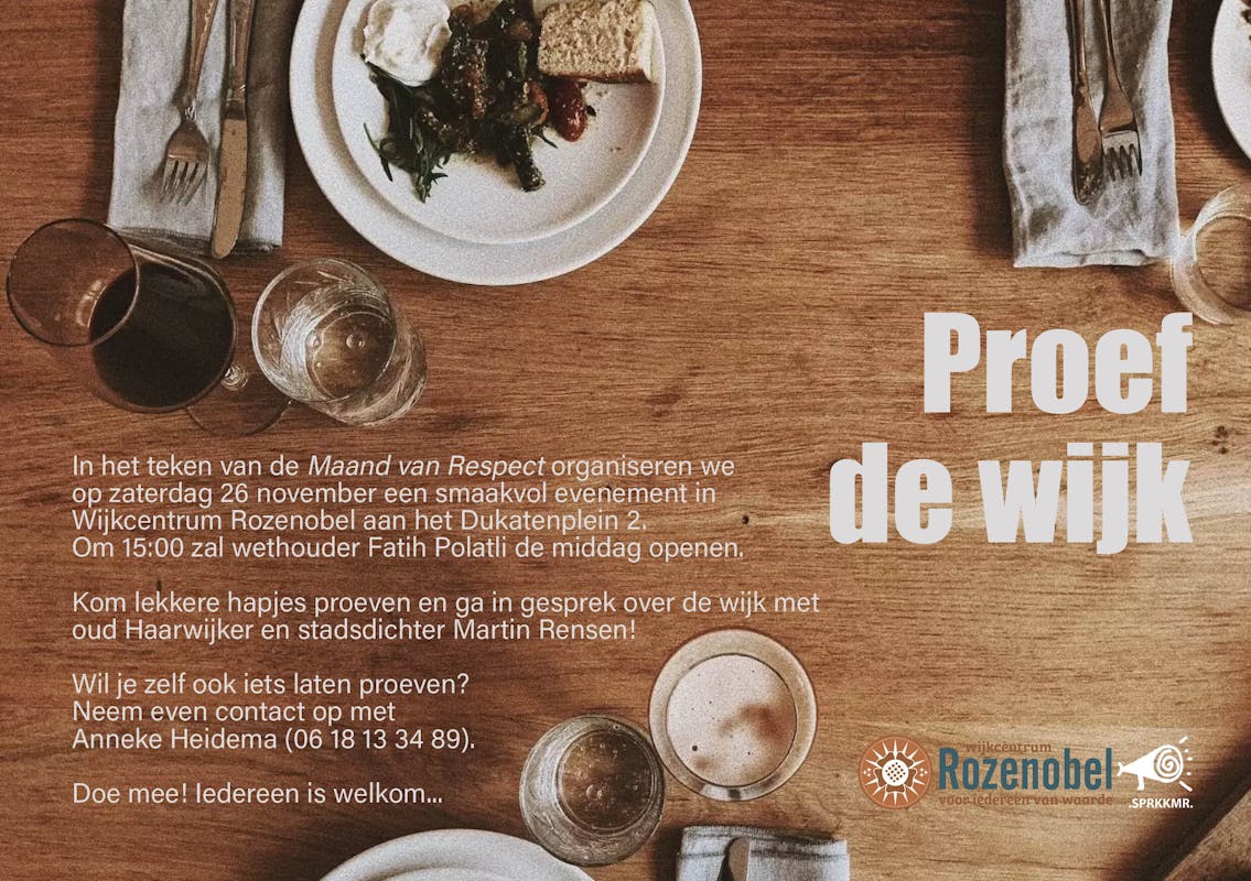 Op zaterdag 26 november om 15:00 uur gaan we in wijkcentrum Rozenobel aan het Dukatenplein 2 gezellig met elkaar in gesprek over de schoonheid van de wijk en haar bewoners. Dat doen we in het kader van De Maand van Respect en daar hoort natuurlijk een lekker hapje bij. Kom langs, doe mee en laat je verrassen! Wethouder Fatih Polatli en stadsdichter Martin Rensen zijn er in ieder geval. En wil je zelf iets laten proeven of heb je een ander leuk idee? Neem dan even contact op met Anneke Heidema (06-18133489).