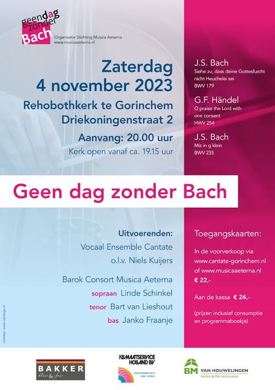 Concert door Vocaal Ensemble Cantate uit Gorinchem en Stichting Musica Aeterna in de concertserie Geen dag zonder Bach. Al meer dan tien jaar brengen Cantate en Musica Aeterna in de wijde omtrek van Gorinchem klassieke muziek voor een breed publiek in deze serie, zoals Bach’s Matthäuspassion, het Membra Jesu nostri van Buxtehude en de Messiah van Handel. Ook in omvang kleinere werken, zoals cantates, staan regelmatig op het programma. Vanavond worden uitgevoerd:
