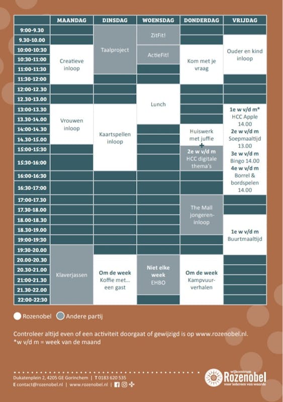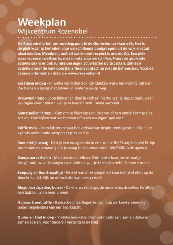 Voor meer informatie kunt u op de website www.rozenobel.nl naar "activiteiten" gaan. Klik op de activiteit waarvoor u interesse heeft en u ziet informatie over de inhoud ervan en waar u terecht kunt met vragen en of aanmelding nodig is en bij wie.