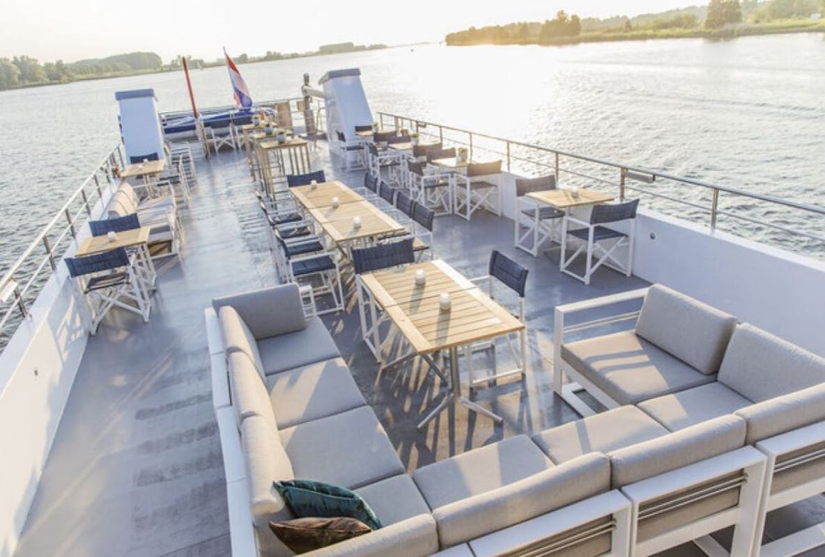Dit jaar varen we met de Z8 van de Zilvermeeuw. Deze elektrische boot is voorzien van drie buitenterrassen, een panaromadek en een stijlvol binnendek. Als de skyline van de Merwede begint te vervelen – al betwijfelen we dat ten zeerste – kunt u ook ontspannen genieten van uw drankje en hapje in de stijlvol ingerichte binnenruimte.