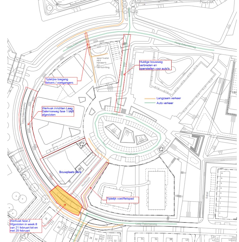 De eerste fase van het westelijk deel is op 18 februari klaar om geasfalteerd te worden. Op maandag 21 februari starten we met de tweede fase. Dit is de kruising van de Laag Dalemsweg met de Kruithoorn. De werkzaamheden om de Kruithoorn aan te sluiten op de Laag Dalemsweg duren één week.