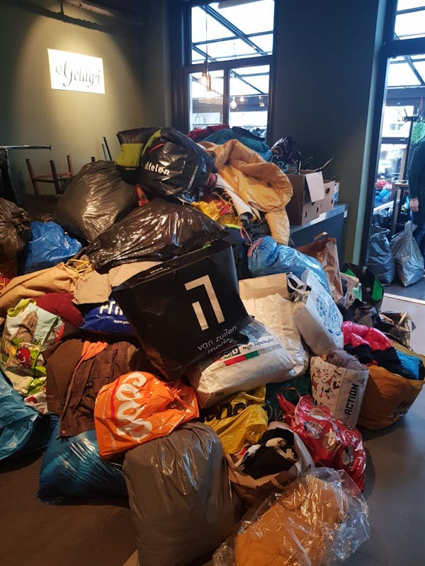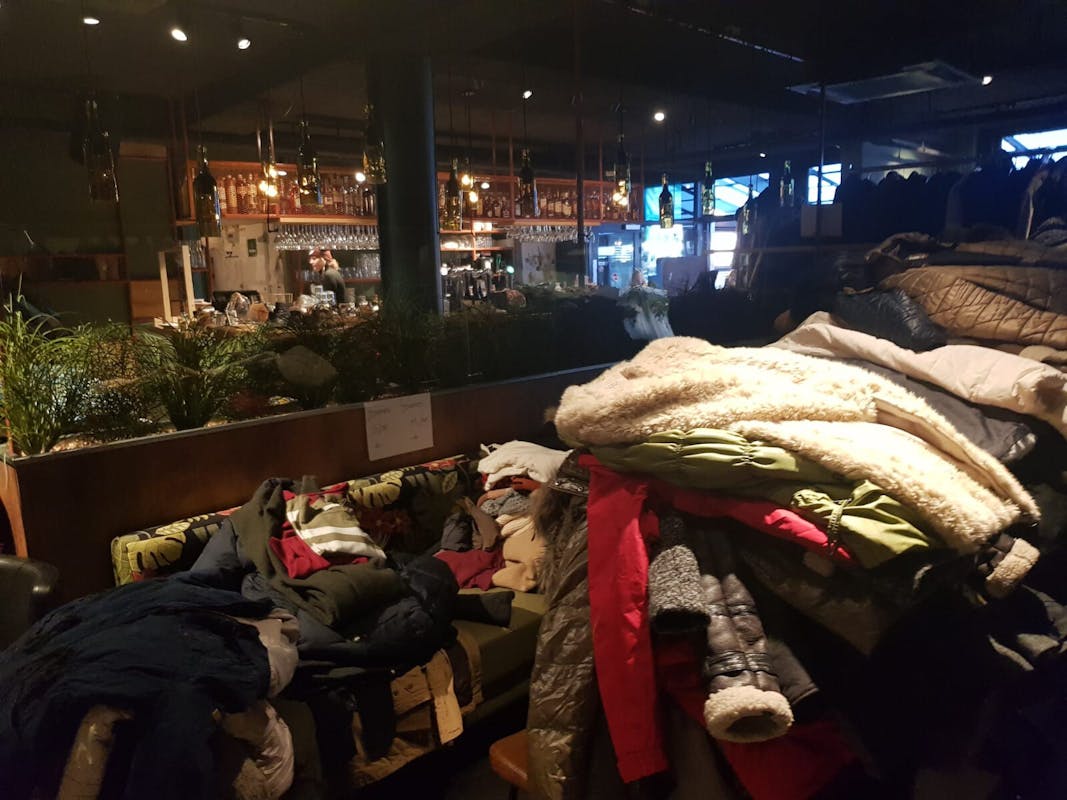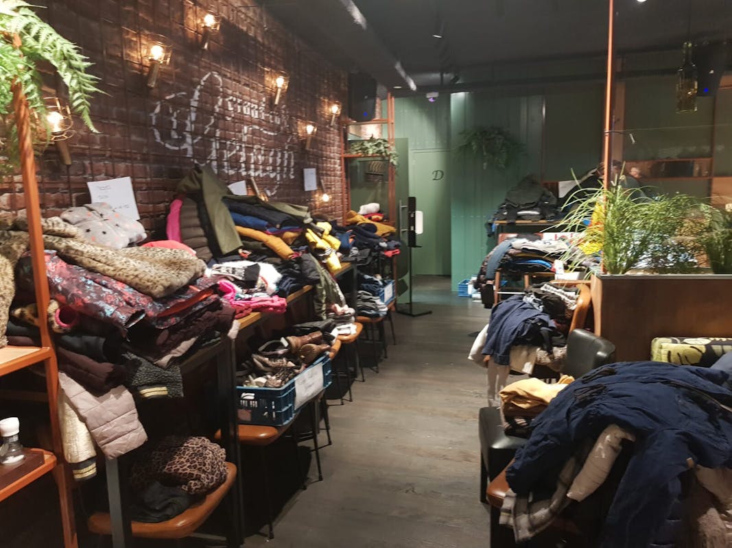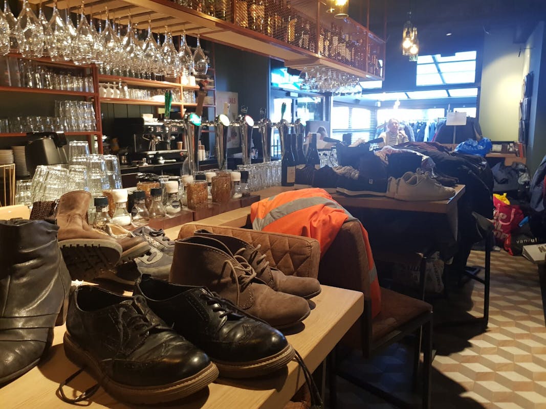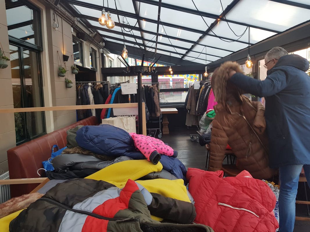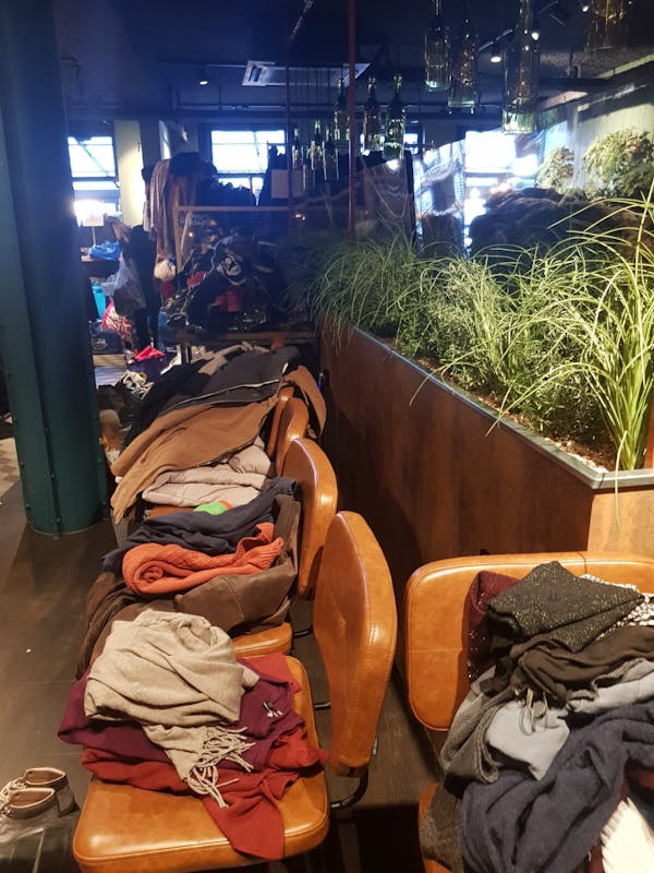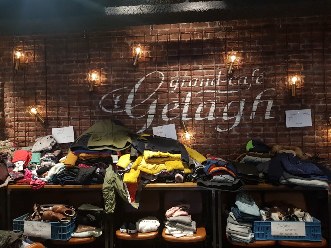 Stapels vol jassen.... jassen, jassen en nog meer jassen. Daar lag 't Gelagh afgelopen zaterdag vol mee. Schoenen op de bar en sjaals over de stoelen. Dat is nog eens een ander gezicht dan een café vol met mensen die eten en drinken.