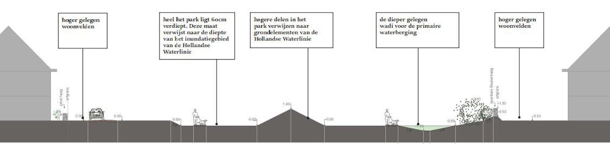 Verschillende dieptes van de wadi’s zorgen voor een variatie waterstanden en zodoende ook aan beplanting/biodiversiteit. De wadi is op meerdere manieren oversteekbaar en toegankelijk gemaakt voor wandelaars en kinderen om deze te kunnen beleven.
