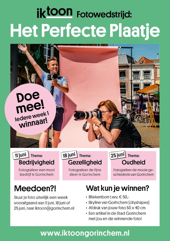 Je foto moet natuurlijk voor de deadline zijn ingeleverd. De maand juni staat in het teken van één van de thema's. Ieder thema heeft dan ook een andere deadline: bedrijvigheid op 11 juni, gezelligheid op 18 juni en oudheid op 25 juni. Iedereen uit Gorinchem en omstreken mag deelnemen. De ingestuurde foto moet wel in Gorinchem zijn gemaakt.