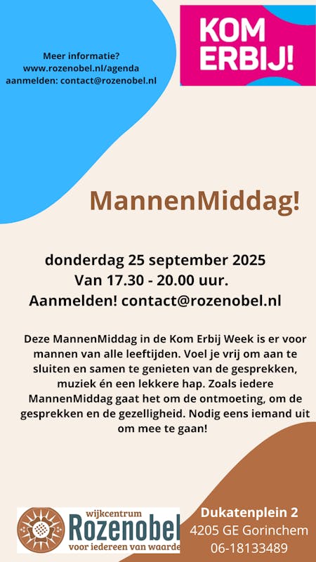 Deze MannenMiddag op donderdag 25 september 2025 van 17.30-20.00 uur in de Kom Erbij Week is er voor mannen van iedere leeftijd.