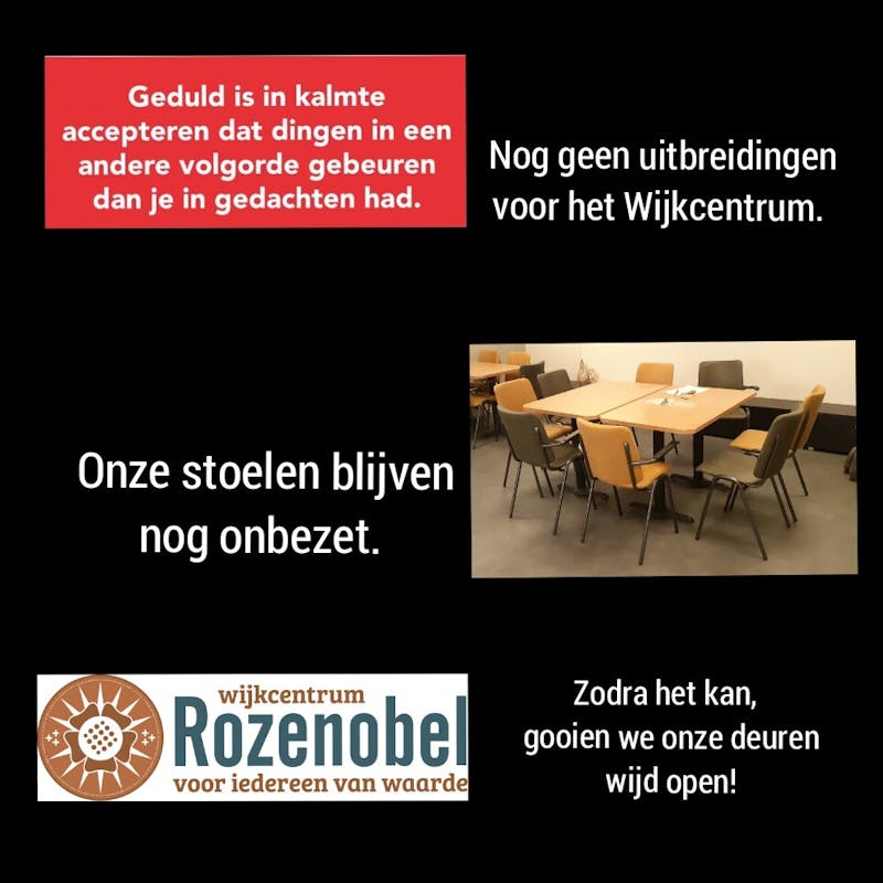 Ook na de persconferentie van vanavond blijft de vrees dat er, ondanks de eerste versoepelingen, nog lange tijd gewacht moet worden voordat wijkcentra en buurthuizen weer volledig open kunnen voor activiteiten en dus voor gasten. In Wijkcentrum Rozenobel wordt niet helemaal stilgezeten. De laatste hand wordt gelegd aan de herinrichting. En om toch iets te doen vieren we, met de nodige maatregelen, Koningsdag met de bewoners van de woningen achter het wijkcentrum. Met mooi weer zullen we 13 mei buiten met wijkbewoners in kleine kring het Suikerfeest vieren. Nog niet helemaal volop bezig maar doen wat we kunnen.