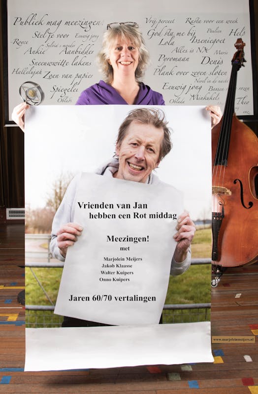 “Je gaat toch wel een voorstelling maken met mijn liedjes?” Dat was een van de dingen die Jan en ik bespraken de laatste keer dat ik hem zag. Die dag heb ik een paar uur met hem doorgebracht. De laatste keer, dat wisten we alle twee. Jan Rot is overleden. Wij waren 20 jaar het duo `An en Jan`. Ik leerde meteen Jakob Klaasse kennen waarmee Jan al 20 jaar samenwerkte. Daarna stonden we samen op de Parade. We hebben samen zoveel prachtige muziek gespeeld! Ongelofelijke knappe vertalingen die je het origineel doen vergeten.