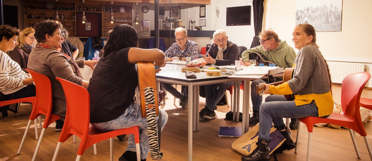 In de verschillende tekstmappen (60s-70s-80s-90s-NLtalig-duetten) zit voor iedereen wel iets bekends. Onder begeleiding van akoestische gitaar zingen we de liedjes waar we op dat moment zin in hebben. En alleen luisteren en er gewoon gezellig bij zijn, mag ook!