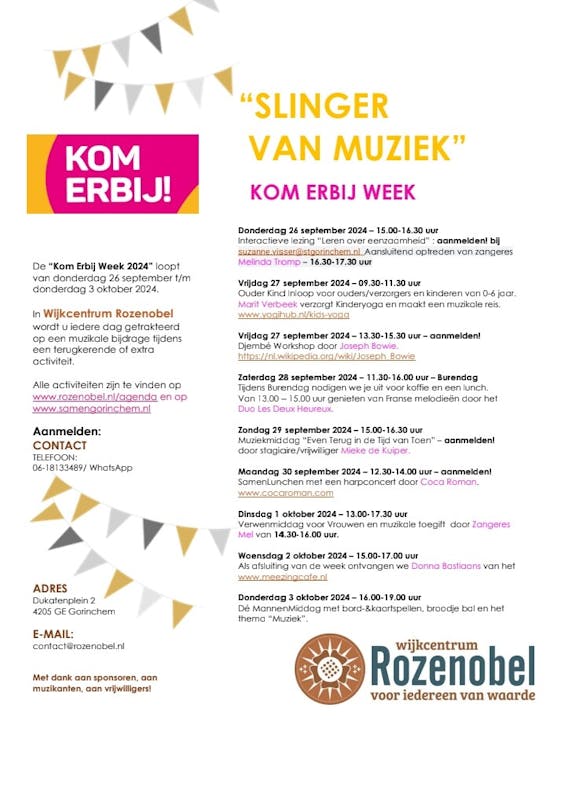 In het kader van de Kom Erbij Week 2024 presenteert Wijkcentrum Rozenobel de "Slinger van Muziek" van 26 september t/m 3 oktober 2024.
