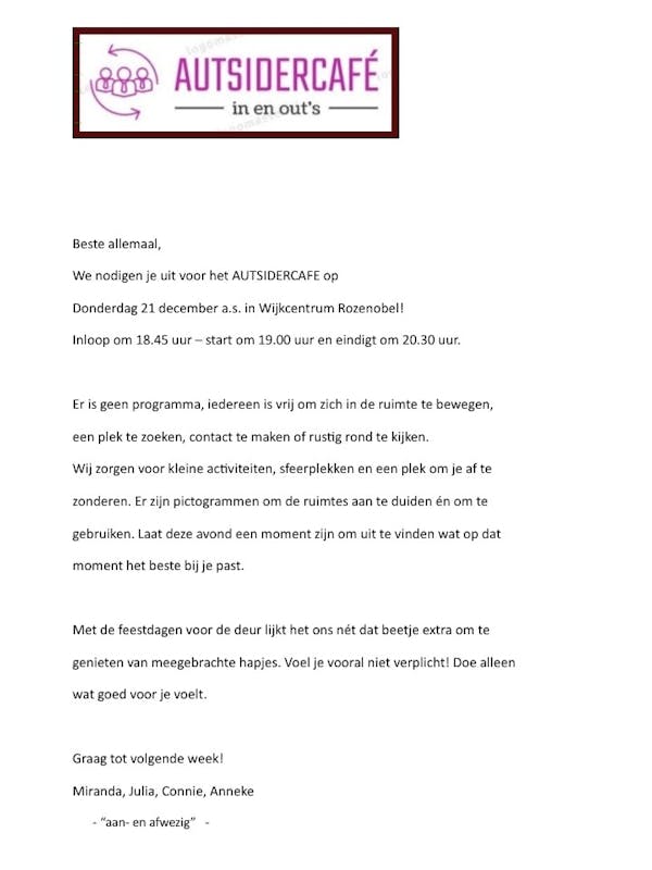 Op 21 december a.s. om 18.45 uur in Wijkcentrum Rozenobel start de inloop van de derde bijeenkomst op rij van het Autistencafé! voor volwassenen met een vorm van autisme. In samenwerking met ASVZ en de Boba Groep organiseren we de bijeenkomsten op basis van de behoeftes, die bij de deelnemers leven.