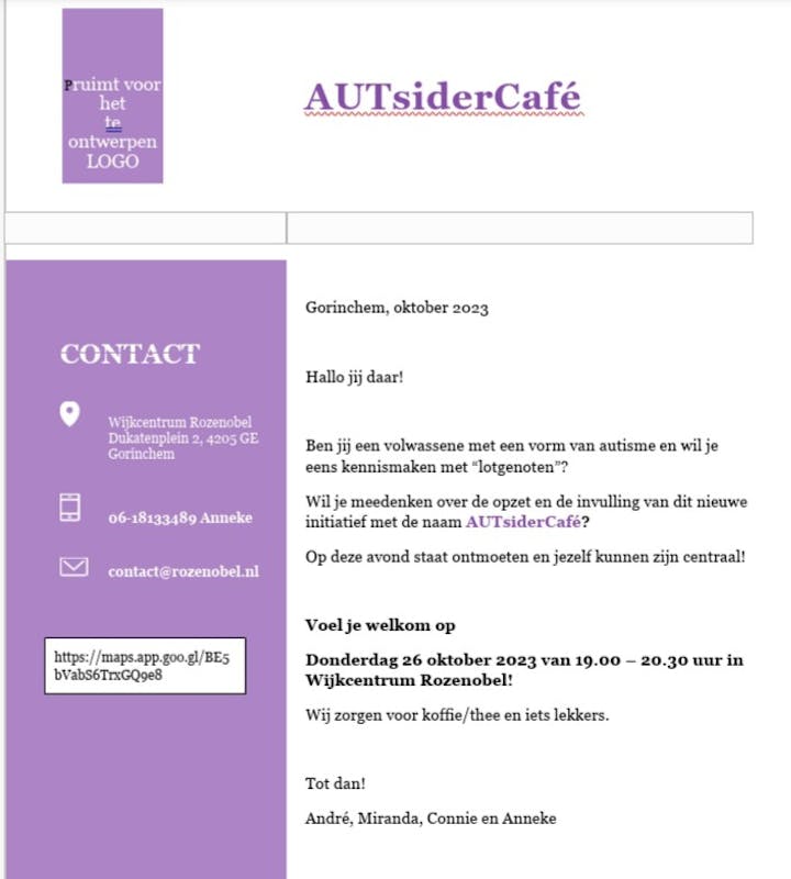 In samenwerking met ASVZ, Boba en Wijkcentrum Rozenobel start op donderdag 26 oktober 2023 om 19.00 uur de eerste inloop van het "AUTsiderCafé" voor volwassenen in Wijkcentrum Rozenobel!