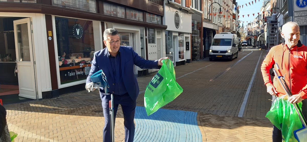Winkeliers van de Burgstraat en de Hoogstraat veegden hun straatje schoon tijdens de tweede Schone-winkelstraat-estafette op 3 mei. Zij maakten samen met de winkeliers van de Gasthuisstraat één lange schone winkelstraat. Wethouder Polatli, leefbaarheid & buitenruimte, liet een sirene loeien als startsignaal en hielp enthousiast mee het opschonen van de Hoogstraat.