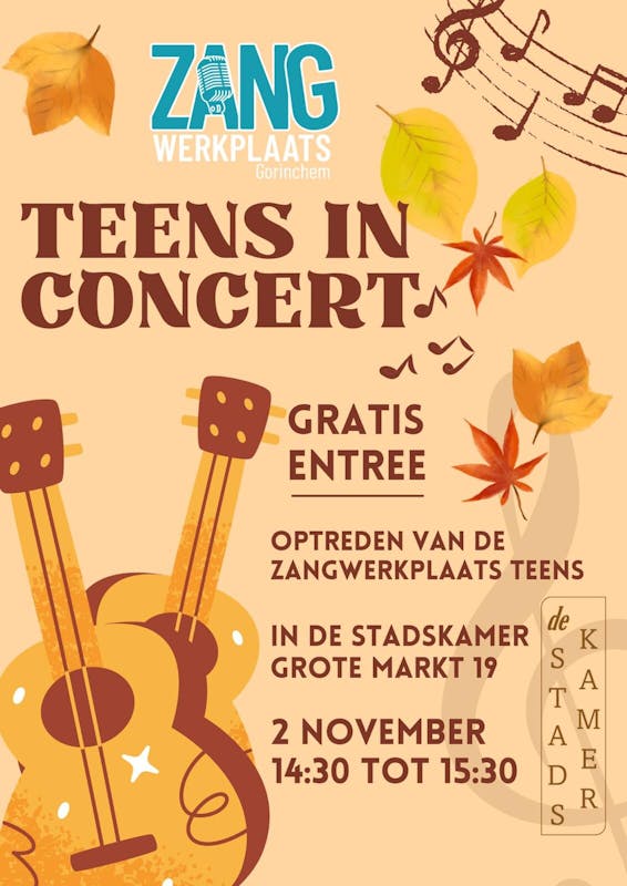 Op zondag 2 november vullen de Teens van Zangwerkplaats Gorinchem De Stadskamer met een vrolijk en kleurrijk herfstprogramma. Vanaf 14.30 uur zingen de jonge talenten meerstemmige popsongs, kleinkunst, levensliedjes, jazzstandards, folk- en showtunes — soms met begeleiding, soms lekker a capella. En het mooiste: het optreden is gratis te bezoeken!Je vindt De Stadskamer op de Grote Markt 19 in Gorinchem.Eerder dit jaar verrasten de Teens al tijdens de Wijdschildroute in de Cultuurmaand. Met zichtbaar plezier en vol energie zingen ze in allerlei stijlen. De Zangwerkplaats staat onder de enthousiaste leiding van Helga Buitelaar.Kortom: een heerlijke muzikale middag om niet te missen!