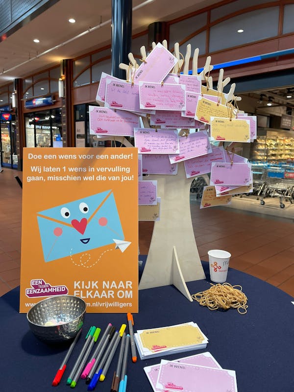 Ook tijdens de Kom Erbij Week en de Welzijnsmarkt in 2024 konden inwoners hun wensen voor anderen delen via deze speciale boom. Een aantal van deze wensen hebben we inmiddels in vervulling laten gaan. Dit past binnen de opgave Betrokken Gorinchem. We willen de betrokkenheid in de stad vergroten. Als mensen elkaar helpen, steunen en accepteren, voelen zij zich minder alleen en meer zelfverzekerd. Dat bevordert saamhorigheid en maakt het leven prettiger voor iedereen.