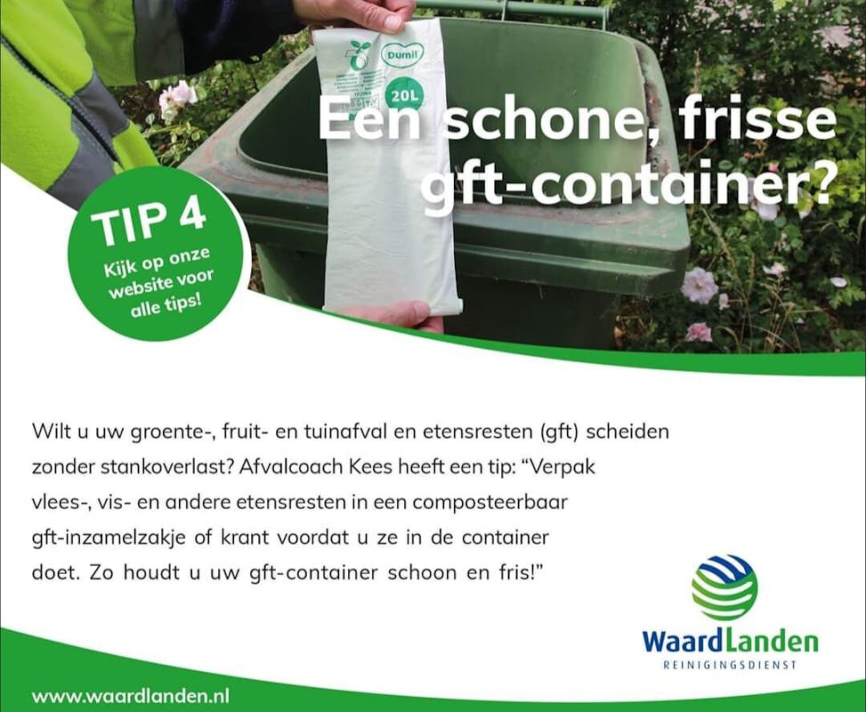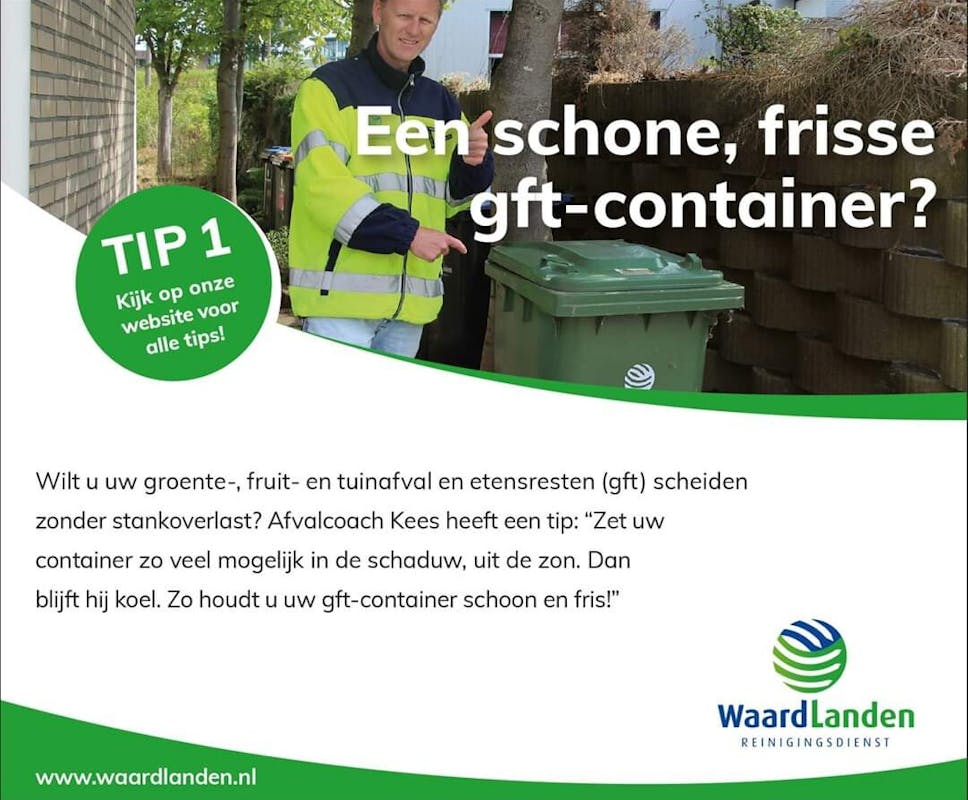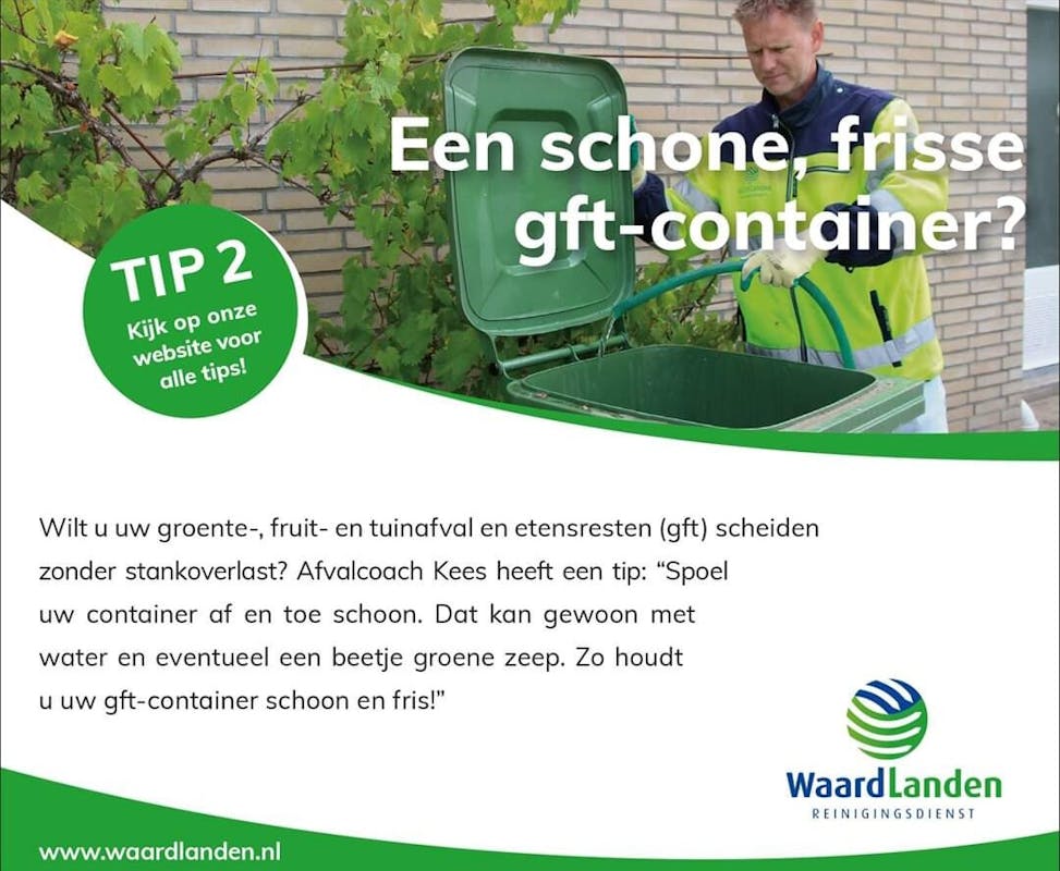 Afvalcoach Kees van Reinigingsdienst Waardlanden geeft je op onderstaande foto's vier tips om je GFT container goed schoon te houden en maken. Handig voor in de zomer! Geen stinkende bak in je tuin :)