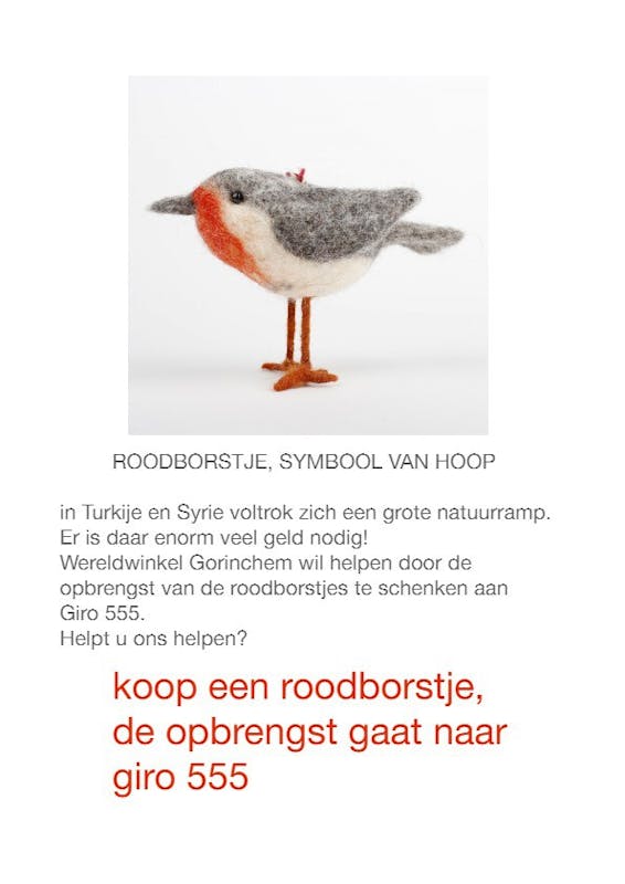 Wereldwinkel Gorkum voert de komende weken actie voor Syrië en Turkije. De opbrengst van de verkoop van vilten roodborstjes komt volledig ten goede aan giro 555 ten behoeve van het Rode Kruis, hulp aan Syrië en Turkije.