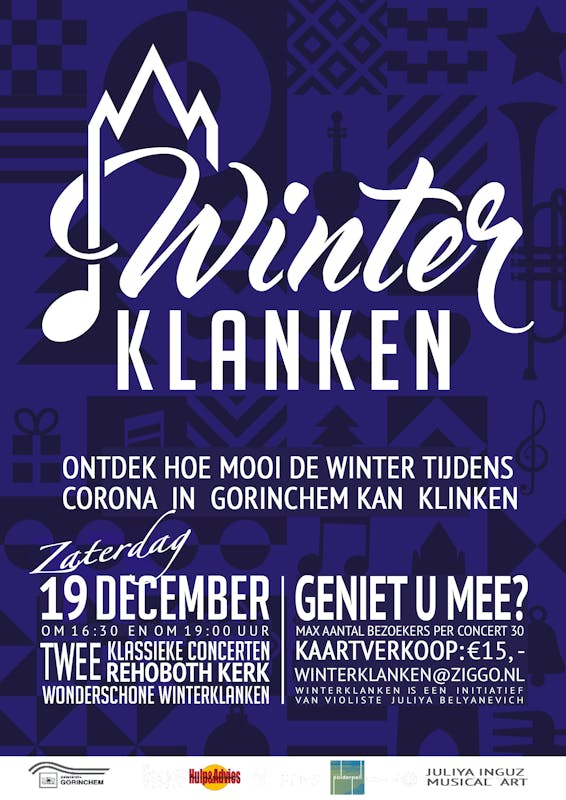 Op zaterdag 19 december kunnen om half vijf ’s-middags en om zeven uur ’s-avonds 30 personen genieten van mooie Winterklanken in de Rehobothkerk. Deze is groot genoeg om op verantwoorde wijze 30 bezoekers corona proof te ontvangen.