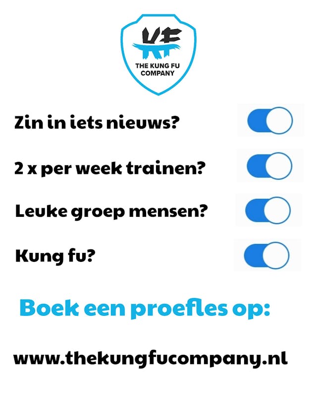 Vanaf dinsdag 22-08-2023 starten we weer met onze reguliere lessen, kijk snel op www.thekungfucompany.nl voor de diverse trainingsmogelijkheden en meld u aan voor een proefles.