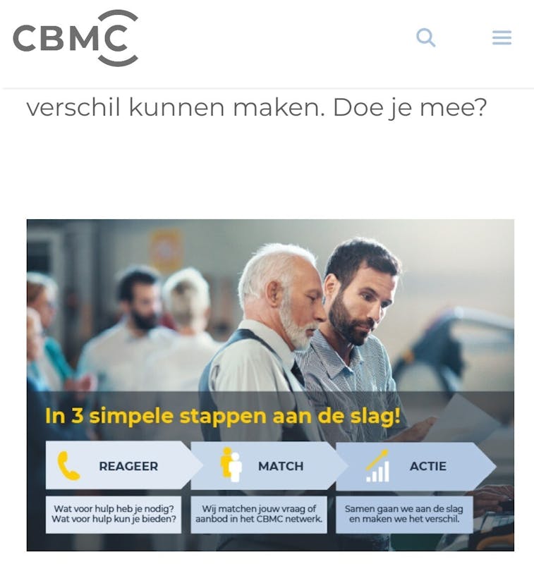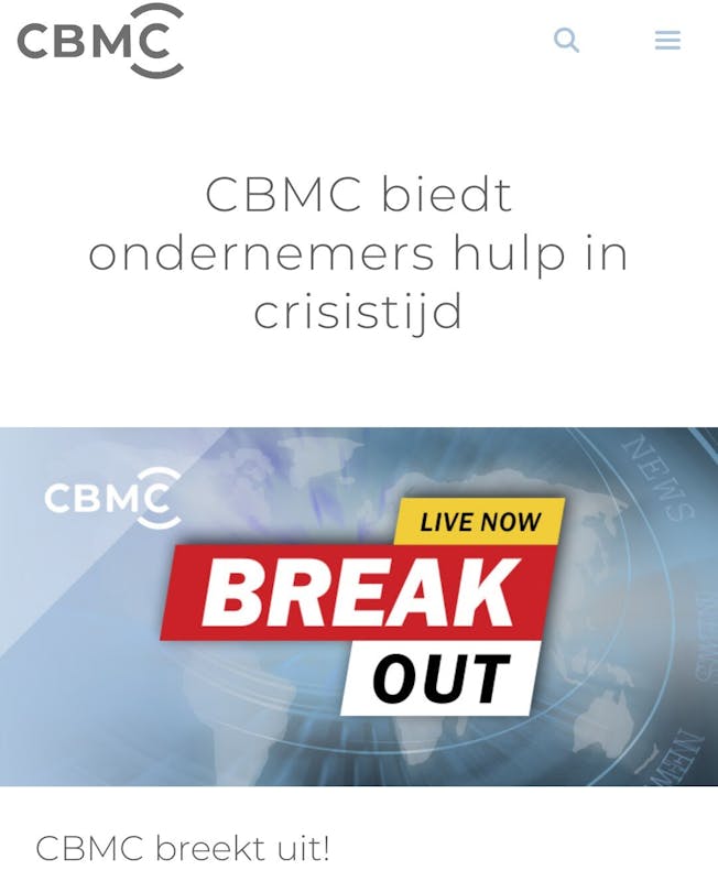 Met CBMC geloven wij dat wij juist in deze crisistijd het verschil mogen maken. Naar binnen en naar buiten! Midden in deze crisis willen wij er zijn voor elkaar en voor de wereld om ons heen. Hoe? Door praktisch te helpen en talenten te delen, want CBMC is hét platform om hulp te krijgen of vice versa hét platform om hulp te bieden van leiders en ondernemers. Kijk en overtuig uzelf op https://www.cbmc.nl/breakout/