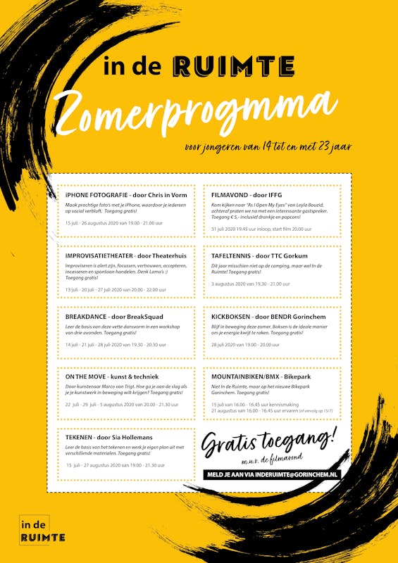 Nieuwsgierig naar alle activiteiten? Kijk dan op de Facebookpagina van In de Ruimte, daar staan welke activiteiten er zijn. Er is elke week wel iets te doen, dus jongeren hoeven zich niet te vervelen. Alle activiteiten, met uitzondering van de filmavond, zijn gratis. Inschrijven kan via . Met de activiteiten hopen we op een extra mooie zomer, die dankzij de coronamaatregelen toch anders verloopt dan anders.