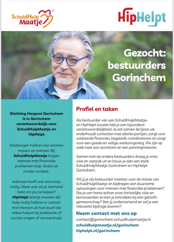 Hoopvol Gorinchem zoekt bestuursleden voor HipHelpt / SchuldHulpMaatje Gorinchem.