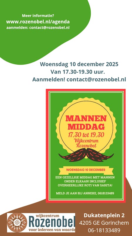 Tijdens de MannenMiddag staat de ontmoeting uiteraard centraal.Deze middag krijgt een invulling én een smakelijke aanvulling tijdens de gezamenlijke maaltijd met overheerlijke "Roti van Sarita"!