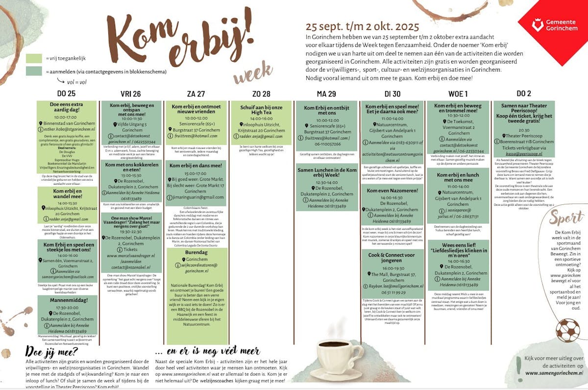Vandaag is de Kom Erbij Week gestart. Een landelijke campagne ook bekend als de Week tegen Eenzaamheid waarin van donderdag 25 september tot en met woensdag 1 oktober de focus ligt op vriendelijk zijn voor elkaar en samen activiteiten ondernemen. Ook binnen de gemeente Gorinchem zijn vele activiteiten beschikbaar waar je aan kunt deelnemen. (Zie de foto voor een overzicht van de vele activiteiten).