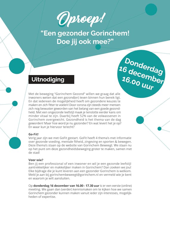 Een gezonde leefstijl, juist nu! Ben jij diegene die we zoeken om mee te denken en doen aan “Gorinchem Gezond”? Check de uitnodiging, iedereen die een bijdrage wil leveren op zijn/haar manier is welkom!