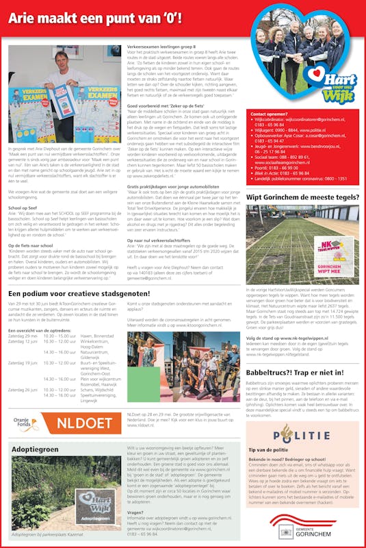 In de Hart voor uw wijk special van mei maakt Arie Diephout een punt van nul vermijdbare verkeersslachtoffers. Hij vertelt wat de gemeente doet aan verkeersveiligheid voor de jeugd. Zo is er een film 'Zeker op de fiets' speciaal voor kinderen van groep 8 in Gorinchem en omstreken die voor het eerst naar het voortgezet onderwijs gaan. Op een interactieve wijze worden ze voorbereid op veelvoorkomende, uitdagende verkeerssituaties in Gorinchem. Het is echt de moeite waard een kijkje te nemen op www.zekeropdefiets.nl.