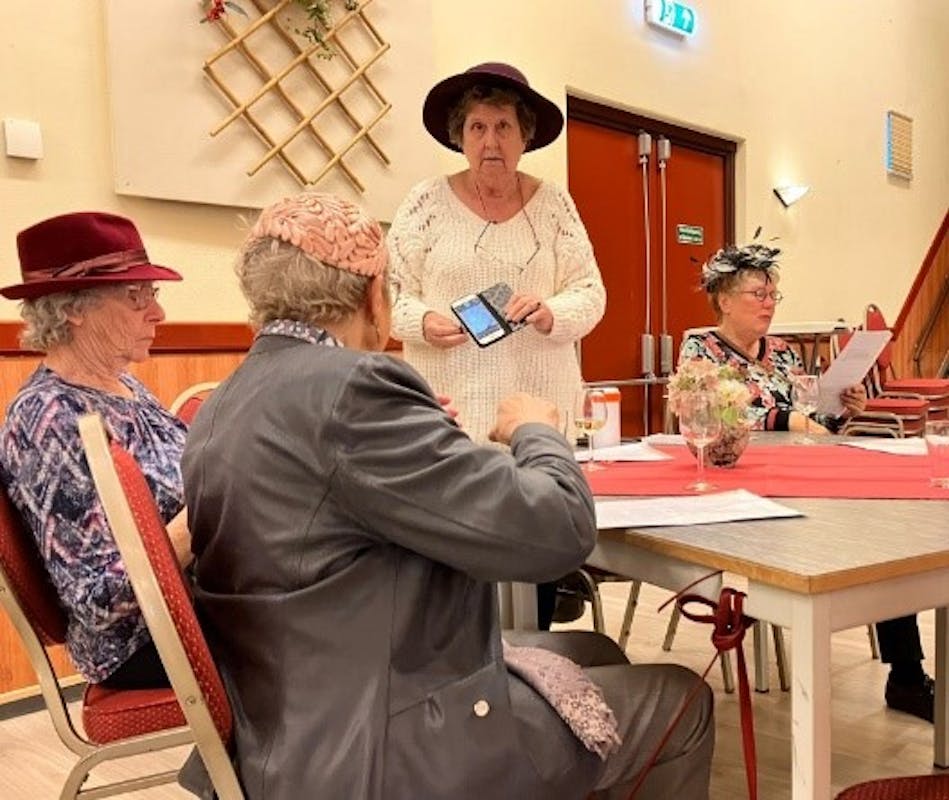Het werd half februari een bijzonder gezellige middag in Spijk. Wil Gorter van het Hoedenmuseum uit Andijk was te gast met een deel van de collectie hoeden en petten. Voor een enthousiast publiek van ruim 30 gasten en vrijwilligers vertelt Wil hoe hoeden worden gemaakt en wanneer hoeden worden gedragen. Met veel humor en anekdotes toont Wil tientallen soorten hoeden en petten uit vervlogen tijden en uit alle windstreken. “Het was een hele leuke middag, wat jammer dat er eigenlijk niet heel belangstelling was. Onze gasten hebben genoten, “ aldus organisator Ton Smits. En dat klopt. Eén van de gasten was mevrouw Hortensius. “We vonden het super, wat een leuke middag was het.