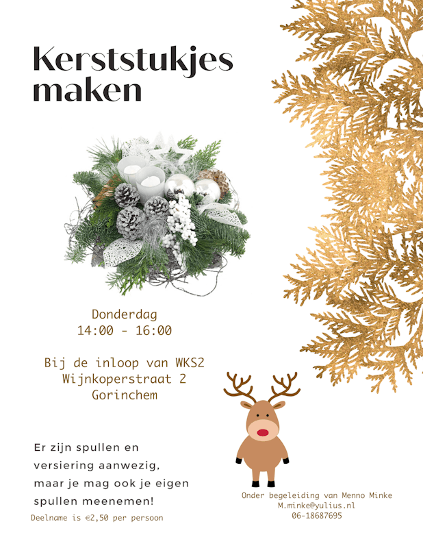 Wil je geen kerststukjes maken, maar heb je wel behoefte aan wat gezelligheid? Dan ben je natuurlijk ook van harte welkom.