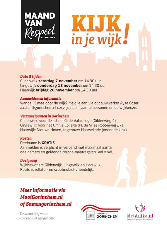 Stadsgids Anika geeft tijdens de Maand van Respect 3 wandelingen door de Gildenwijk, Lingewijk en Haarwijk. De wandeling is voor inwoners van deze wijken. Wat weet jij eigenlijk allemaal van jouw omgeving? Tijdens deze gezellige wandeling met je mede wijk-inwoners krijg je meer te horen over de cultuur, historie en actuele functies van belangrijke punten in jouw wijk. Geef je snel op en laat je verrassen door verhalen en ervaringen die Anika voor je heeft geregeld!