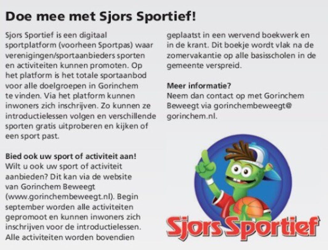 Samen staan we voor sport in Gorinchem! Heb jij een goed sportinitiatief waarmee je hieraan bij kunt dragen? Klik dan hier Gorcums sportinitiatief . Voor meer informatie, ...