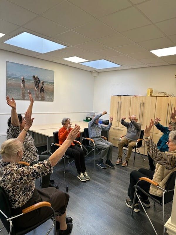 Na de koffie was er de mogelijkheid voor stoelgym. Wie nog meer beweging wilde ging daarna door naar de sjoelbakken. Wie even rustig aan wilde doen ging creatief aan de gang of een praatje doen.
