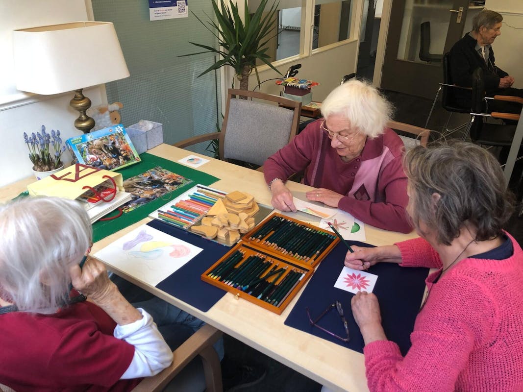 Vandaag zijn we weer heerlijk aan de wandel geweest en Theresia gaf weer een inspirerende tekenles én ze trakteerde op gevulde koek paashazen.
