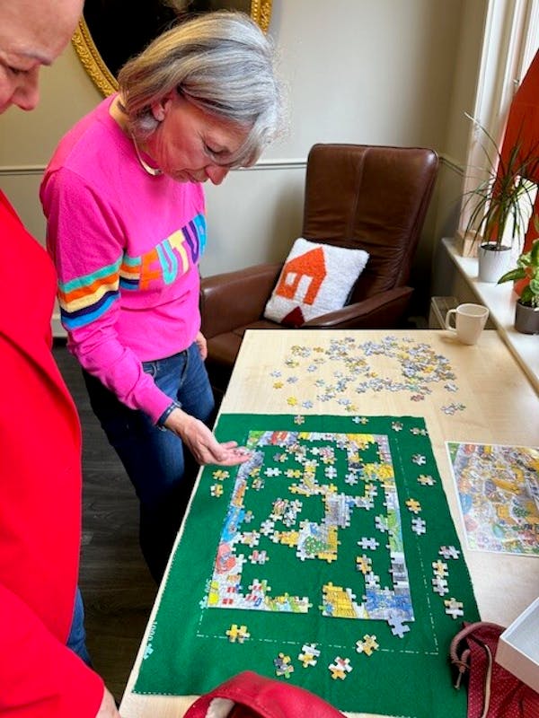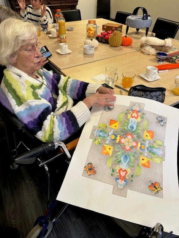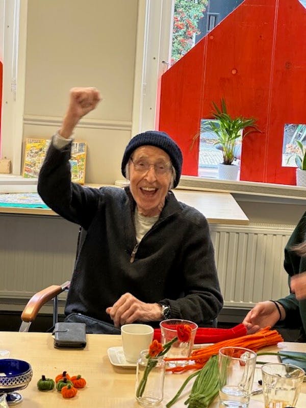 Na de lunch sloten twee leerlingen van de zorghavo aan van het Lyceum Oudehove. Deze leerlingen waren hier als onderdeel voor een oriëntatie op verschillende zorginstellingen. Na een korte uitleg van wat een Odensehuis is werden de dames voorgesteld aan de bezoekers. Heel mooi om te zien hoe ze zich gelijk mengde met de bezoekers en actief deelnamen aan de activiteiten.
