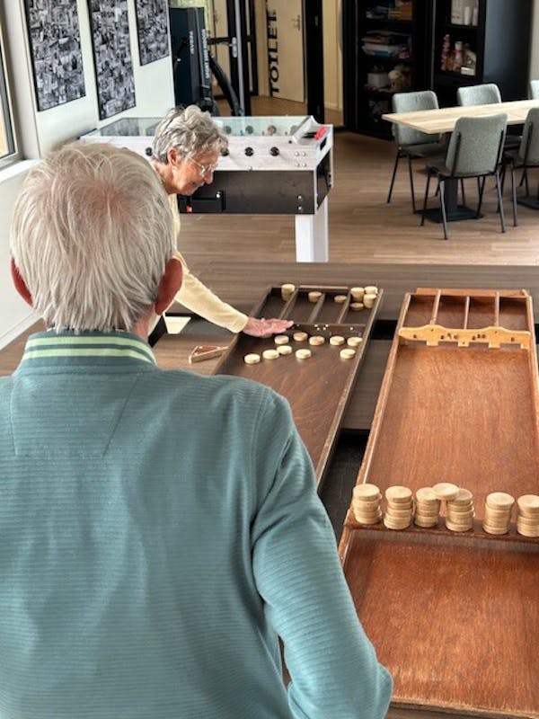 Vandaag deed eenieder waar hij of zij zin in had. Daardoor hebben twee bewoners ons meegenomen naar de historie van hun vroegere woonplaats aan de hand van afbeeldingen op het internet. We kennen weer leuke, nieuwe feitjes van Haarlem en Leiden. Sommige zijn verder gegaan met hun creatieve tekeningen van verleden week. En andere zijn sportief geweest met hun oude, vertrouwde sjoelen. Het was weer heel gezellig met elkaar. Ook zin in zo´n gezellige dag? Op de maandag bent u van 10:00 tot 15:00 van harte welkom