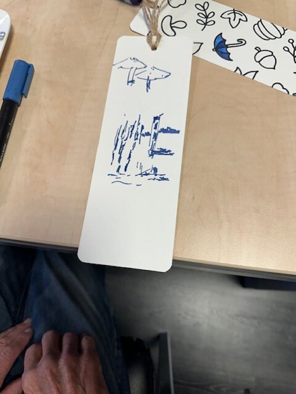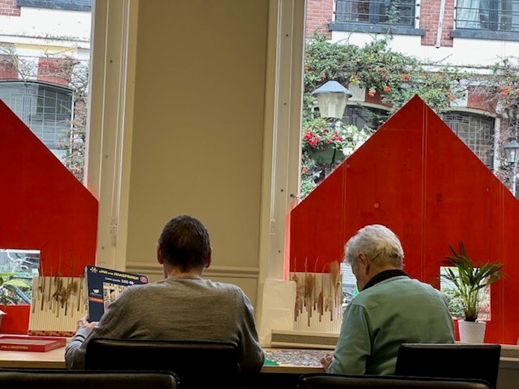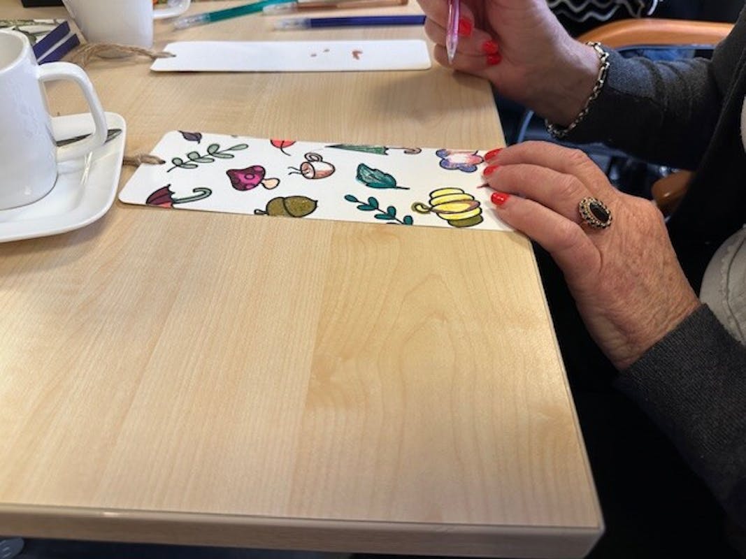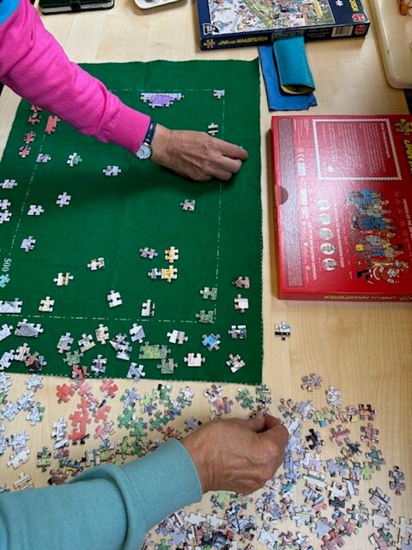 Onze gebruikelijke activiteiten gaan ook gewoon door. Vandaag zijn boekenleggers gemaakt en gekleurd, Is er gepuzzeld en is een herfstslinger gemaakt. Tijdens de activiteiten liep een echtpaar spontaan binnen. Meneer vertelde over de wijk waar hij in zijn jeugd gewoond had en liet daar ook mooie foto's van zien. Wat bleek, de mevrouw naast hem was daar ook opgegroeid. De meneer voelde zich gelijk op zijn gemak. Terwijl de heer bleef lunchen, ging mevrouw snel een boodschap doen. Deze kleine interacties maken de sfeer nog levendiger.