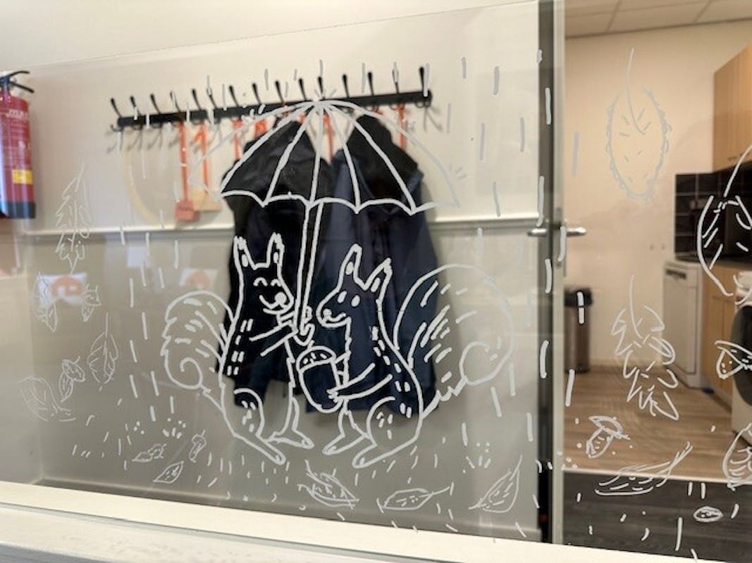 Hoe zag de dag eruit?. Na de koffie zijn we gestart met stoelgym. Dit was een geweldige manier om de dag sportief te beginnen. Daarna was er ruimte voor creativiteit en spel. Wat inhoudt dat een gedeelte van de bezoekers aan de gang ging met het opfleuren van bestaande tekeningen op glas. Een ander groepje ging 4 op een rij spelen. Er werd gewerkt aan de herfstversiering voor op tafel en Karin is begonnen met het opfleuren van onze ramen aan de straatzijde. Aan de linkerkant ziet u nu onze openingstijden op een hele gezellige manier weer gegeven.