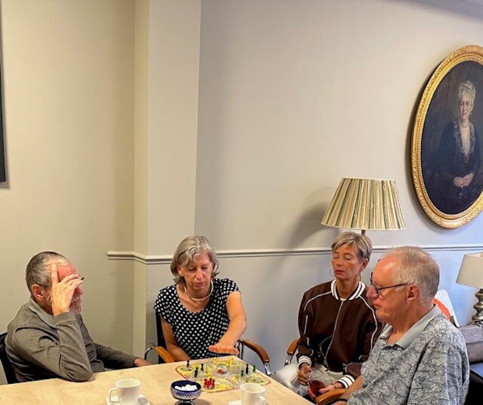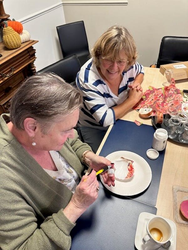 Na de lunch was er ruimte voor nog meer knutselen. Nu werden er schelpen en potjes versierd met figuren uit servetten die o.a. vakkundig werden uitgeknipt door Charlotte en opgeplakt door Net. Dat af en toe gade geslagen door de heren die een potje dammen speelde.