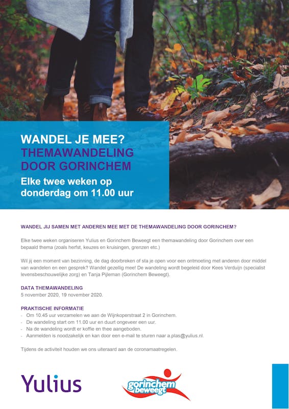 Elke twee weken organiseren Yulius en Gorinchem Beweegt een wandeling door Gorinchem met een bepaald thema. Aanstaande donderdag wordt er weer gewandeld, doe je ook mee? Voor meer informatie kijk op bijgevoegde informatie!Meer berichten van Gorinchem Beweegt